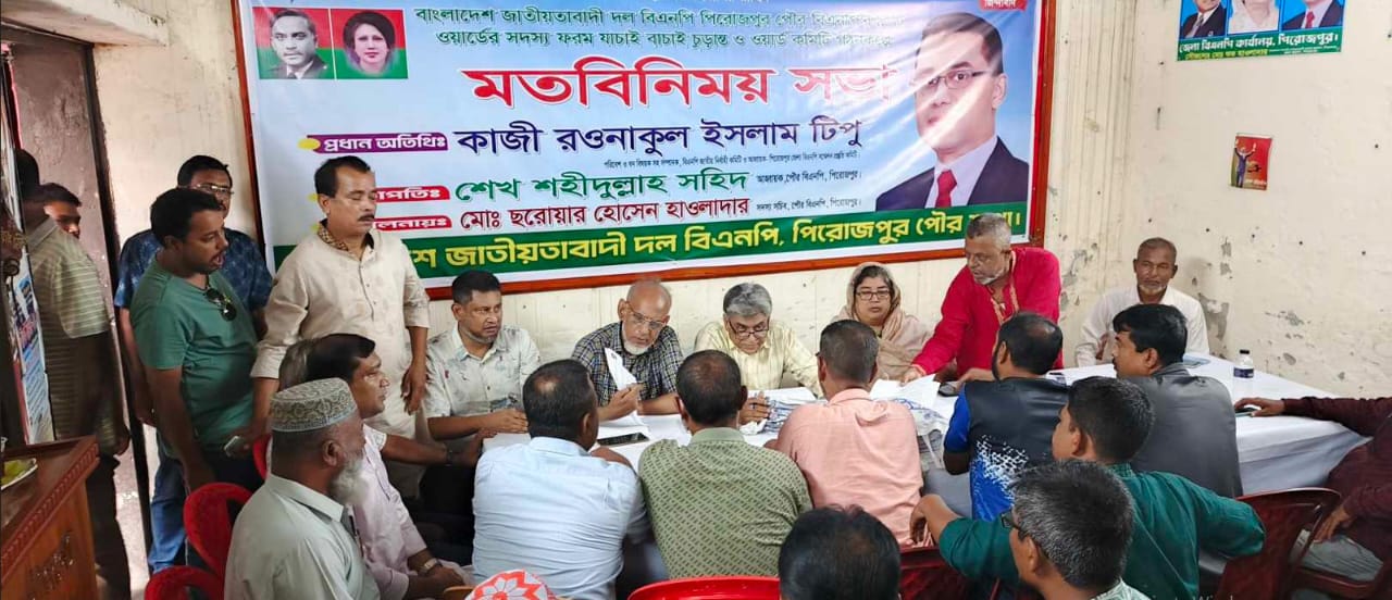 পিরোজপুর প্রতিনিধি : পিরোজপুরের পৌরসভার ৯টি ওয়ার্ডে বিএনপির সদস্য ফর্ম যাচাই বাচাই করে ওয়ার্ড কমিটি গঠনের লক্ষে যাচাই বাচাই কার্যক্রম করেছে পিরোজপুর পৌরসভা বিএনপি। আজ সোমবার দুপুরে জেলা বিএনপি কার্যালয়ে সদস্য ফর্ম যাচাই বাচাই চুড়ান্ত ও ওয়ার্ড কমিটি গঠনের লক্ষে বাছাই অনুষ্ঠানে প্রধান অতিথি হিসেবে উপস্থিত ছিলেন জাতীয়তাবাদী দল কেন্দ্রীয় নির্বাহী কমিটি বন পরিবেশ বিষয়ক সহ সম্পাদক ও পিরোজপুর জেলা বিএনপির সম্মেলন প্রস্তুত কমিটির আহবায়ক কাজী রওনাকুল ইসলাম টিপু।