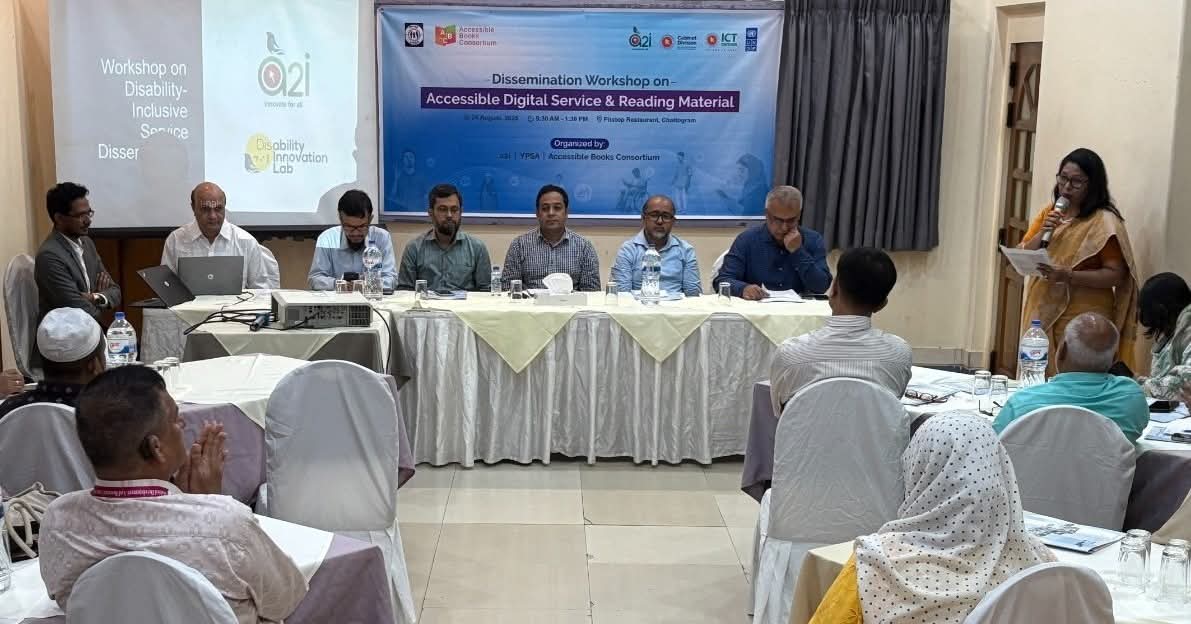 প্রতিবন্ধী ব্যক্তিদের জন্য সরকারি ডিজিটাল সেবাসমূহকে আরও সহজলভ্য, অন্তর্ভুক্তিমূলক ও কার্যকর করে তোলার লক্ষ্য নিয়ে চট্টগ্রামে অনুষ্ঠিত হয়েছে ‘Dissemination Workshop on Accessible Digital Service & Reading Material’ শীর্ষক এক দিনব্যাপী কর্মশালা। কর্মশালাটি যৌথভাবে আয়োজন করে এটুআই (a2i), ইয়ং পাওয়ার ইন সোশ্যাল অ্যাকশন (ইপসা) এবং অভিগম্য বই সংস্থা (Accessible Book Consortium)।