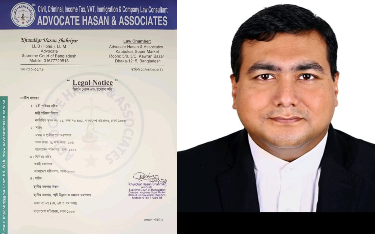 জনস্বার্থে প্রাণী অধিকার রক্ষায় আইনি নোটিশ পাঠানো হয়েছে। রবিবার (১২ এপ্রিল ২০২৬) ডাকযোগে ও ইমেইলে মন্ত্রিপরিষদ সচিব, মৎস্য ও প্রাণিসম্পদ মন্ত্রণালয়ের সচিব, স্বরাষ্ট্র মন্ত্রণালয়ের সিনিয়র সচিব, স্থানীয় সরকার, পল্লী উন্নয়ন ও সমবায় মন্ত্রণালয়ের সচিব, অভ্যন্তরীণ সম্পদ বিভাগ অর্থ মন্ত্রণালয়ের সচিব ও জাতীয় রাজস্ব বোর্ডের চেয়ারম্যান, প্রাণিসম্পদ অধিদপ্তরের মহাপরিচালক এবং আমদানি ও রপ্তানি প্রধান নিয়ন্ত্রকের দপ্তরের প্রধান নিয়ন্ত্রক এর ঠিকানায় এ নোটিশ দিয়েছেন অ্যাডভোকেট হাসান এন্ড এসোসিয়েটস এর স্বত্ত্বাধিকারী বাংলাদেশ সুপ্রিম কোর্টের আইনজীবী খন্দকার হাসান শাহরিয়ার।