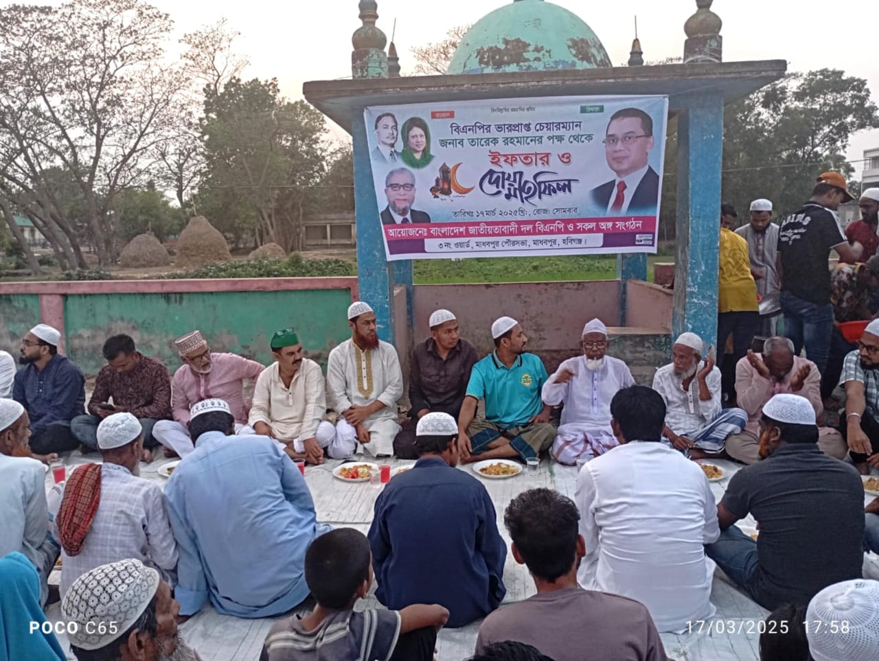 হবিগঞ্জে মাধবপুরে পৌর ঈদগাহ মাঠে ৩নং ওয়ার্ড বিএনপির আয়োজনে সোমবার বিকালে বাংলাদেশ জাতীয়তাবাদী দল বিএনপির ভারপ্রাপ্ত চেয়ারম্যান জনাব তারেক রহমান ও সাবেক প্রধানমন্ত্রী দেশ নেত্রী খালেদা জিয়ার সুস্থতা কামনা করে ইফতার ও দোয়া মাহফিল অনুষ্ঠিত হয়েছে।এ সময় উপস্থিত ছিলেন সাবেক মেয়র হাবিবুর রহমান মানিক, সাবেক ভাইস চেয়ারম্যান ও সাবেক পৌর বিএনপির সভাপতি আব্দুল আজিজ, সাবেক পৌর বিএনপির আহ্বায়ক ও সাবেক কাউন্সিলর আবুল বাশার,পৌর বিএনপির সহ-সভাপতি মাধু মিয়া, পৌর বিএনপির সহ-সভাপতি সালেক মিয়া,৩নং বিএনপির সাধারণ সম্পাদক শফিক মিয়া, বিএনপি নেতা আলী আহমদ,বাজার কমিটির ভারপ্রাপ্ত সভাপতি এমরান খান, সাবেক কাউন্সিলর আফজাল পাঠান, উপজেলা বিএনপির মুক্তিযোদ্ধা বিষয়ক সম্পাদক গোলাপ মিয়া,জেলা ছাত্রদলের সাবেক যুগ্ম সাধারণ সম্পাদক রনি আহমেদ,বুল্লা ইউনিয়নের যুবদলের সাংগঠনিক সম্পাদক আনিছ মিয়া,পৌর যুবদলের আহ্বায়ক জনি পাঠান, সিনিয়র যুগ্ম আহ্বায়ক এমদাদুল হক সুজন, যুবদল নেতা আলমগীর,যুগ্ম আহ্বায়ক জসিম শিকদার, ওয়াসিম আকরাম, পৌর স্বেচ্ছাসেবক দলের আহ্বায়ক আলমগীর কবির, সিনিয়র যুগ্ম আহ্বায়ক রাসেল আহমেদ, উপজেলা ছাত্রদলের সাবেক যুগ্ম আহ্বায়ক সোহেল মাহমুদ,পৌর ছাত্রদলের আহ্বায়ক রিপন মিয়া, যুগ্ম আহ্বায়ক শেখ জাহান রনি, রিংকু দেবনাথ,উপজেলা ছাত্রদলের নেতা সেজান আহমেদ, সাব্বির আহমেদ,যুবদল নেতা রাসেল মিয়া, এমরান মিয়া সহ অসংখ্য নেতা কর্মী ও এলাকার বিশিষ্ট ব্যক্তিবর্গ।