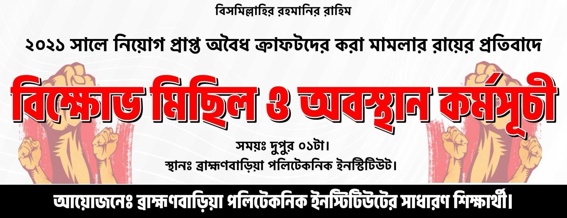 আজ১৯ মার্চ বুধবার সকাল ১০ ঘটিকার সময় ব্রাক্ষণবাড়িয়া পলিটেকনিক ইনস্টিটিউটের সাধারন শিক্ষার্থীরা ঢাকা-সিলেট মহাসড় অবরোধ করেন,তারা জানান গতকাল মহামান্য হাইকোর্ট ৩০% পদ ক্রাফট ইন্সট্রাক্টরদের পদন্নোতির পক্ষে রায় দেয় যার ফলে, যারা ডিপ্লোমা পাস করে বের হবে তাদের চাকরির শূন্য পদ ৩০ % কমে যাবে। এবং বেকারত্ব বেরে যাবে ডিপ্লোমা পাস করা সাধারন ছাত্রদের, তাই হাইকোর্টের এই সিদ্ধান্তের প্রতিবাদে “ব্রাহ্মণবাড়িয়া পলিটেকনিক ইনস্টিটিউট”সাধারণ শিক্ষার্থীরা ঢাকা-সিলেট মহাসড়কে প্রায় ৩ ঘন্টার ও অধিক সময় শান্তিপূর্ণ মানববন্ধন ও বিক্ষোভ কর্মসূচি পালন করে।সব শেষে পরিস্থিতি নিয়ন্ত্রণে আনেন বিজয় নগর থানার ভারপ্রাপ্ত কর্মকর্তা ও জেলা প্রশাসকের প্রতিনিধিরা উপস্থিত হয়ে আন্দোলনকারিদের মেনে নেওয়া হবে বলে আশ্বাস দেন এবং সাধারন শিক্ষার্থীদের পক্ষ থেকে একটি স্মারকলিপি প্রদান করেন।