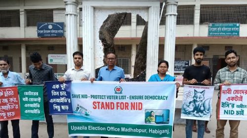 মাধবপুরে নির্বাচন অফিসের স্ট্যান্ড ফর এনআইডি কর্মসূচীর মানববন্ধন