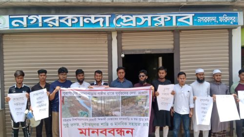নগরকান্দায় দুর্বৃত্তদের দেওয়া আগুনে পুড়ে ভস্মিভূত ঘরবাড়ি, বিচারের দাবীতে মনববন্ধন